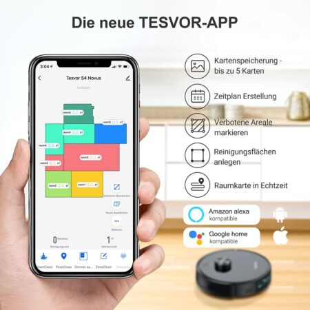 Die Tesvor App arbeitet direkt mit dem Tesvor S4 Saugroboter zusammen. In der App können Karten von bis zu fünf Stockwerken gespeichert und jederzeit abgerufen werden. Es können verbotene Areale angelegt werden, innerhalb welcher der Roboter nie operieren soll. Außerdem können Reinigungszyklen für jeden einzelnen Raum angelegt werden. Wer Haustiere hat oder gerne ständig staubfrei schlafen möchte, kann die betroffenen Räume somit häufiger reinigen lassen. Außerdem können mithilfe der App strenge Zeitpläne für die Reinigung konfiguriert werden, welche der Tesvor S4 dann zuverlässig einhält.