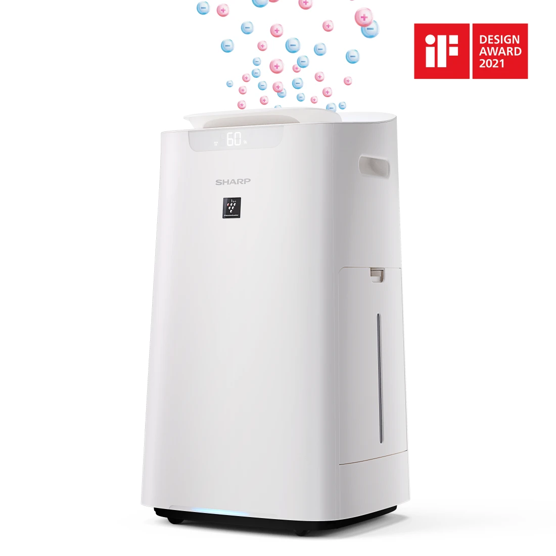 Der Sharp UA-KIL80E-W Luftreiniger mit Befeuchtungsfunktion ist ein weißes Gerät mit einem Kunststoffgehäuse. Das mag zunächst wenig spektakulär klingen, doch das Gerät von Sharp wurde mit dem Design Award 2021 ausgezeichnet, und das fällt auf. Eine weiße Front, unauffällig integrierte Tragegriffe, hochwertig anmutende Tasten – der UA-KIL80E-W sieht nicht nur luxuriös aus, er ist auch so verarbeitet und fällt aufgrund seines modernen Designs vor einer weißen Wand, im Bad, der Küche oder sonst wo im Haushalt kaum auf. So kann er ungestört seine Arbeit verrichten und unsere Luft von unangenehmen Nebenerscheinungen befreien.