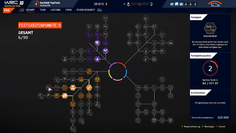 Vergesst nicht die Forschung und Entwicklung und setzt eure hart erspielten Fertigkeitspunkte geschickt ein um euch und euer Team nach vorne zu bringen. Die Fertigkeitsbäume teilen sich in die vier Kategorien Team, Leistung, Crew und Zuverlässigkeit auf. Auf welchem Hauptattribut ihr den Fokus setzt, ist euch überlassen und nur durch entsprechend voraussetzende Fähigkeiten begrenzt.