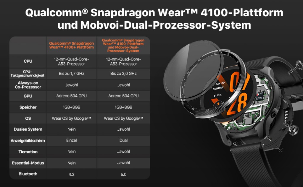 Die TicWatch Pro 3 Ultra GPS wird mithilfe des Wear OS Betriebssystems von Google betrieben. Sie nutzt einen Chip von Qualcomm, um schnell reagieren und agieren zu können. Der 1GB große Arbeitsspeicher sorgt für ein flüssiges Verhalten, auch wenn mehrere Applikationen geöffnet sind. Ein NFC-Chip, Bluetooth 5.0 und WLAN sorgen für Konnektivität. Zum Bezahlen mit der Smartwatch kann Google Pay genutzt werden.