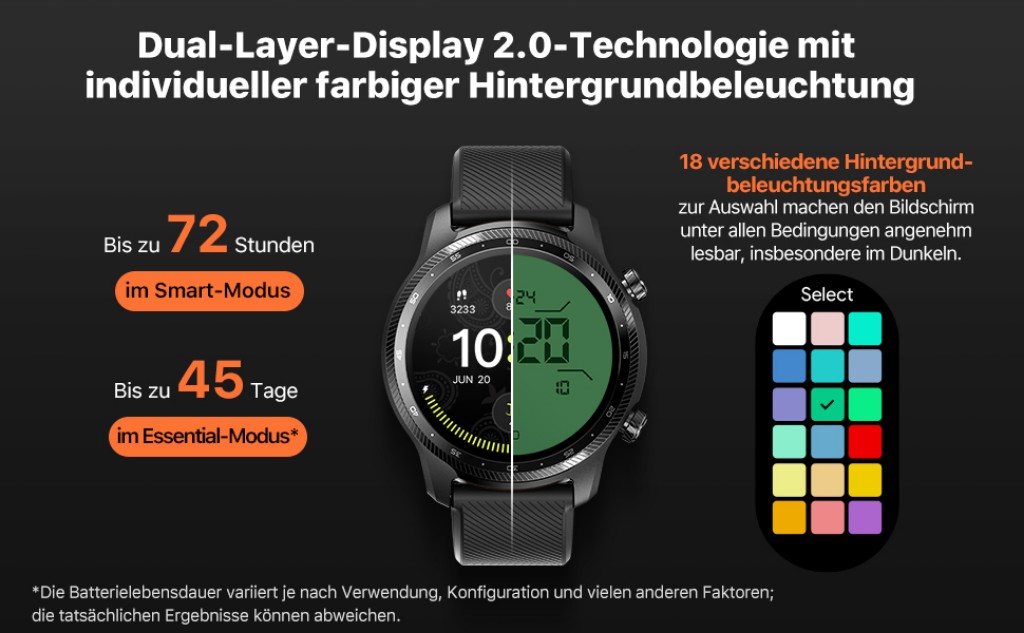 Das Display der TicWatch Pro 3 Ultra GPS ist hell, kontrastreich und dazu überaus stromsparend. Dies erzielt der Hersteller Mobvoi, indem er seine Dual Display 2.0-Technologie nutzt und damit ein stromsparendes Display auf einem farbstarken AMOLED-Bildschirm verbaut. Je nach Anwendungsfall werden somit zwei verschiedene Modi möglich: im Smart Mode werden Applikationen mit bunten und ansprechenden Farben auf dem AMOLED-Bildschirm angezeigt, während im Essential Mode das stromsparende Display zum Einsatz kommt und hier lediglich die relevanten Details in schwarz-weiß einblendet. Mit dem 577mAh starken Akku, der in der Uhr verbaut ist, entsteht damit eine Akkulaufzeit, die sich variabel in die Länge ziehen lässt. Im Essential Mode hält der Akku somit bis zu 45 Tage – ein Monat an Akkulaufzeit ist damit auf Dauer durchaus realistisch. Im Smart Mode hält die Uhr ganze 72 Stunden lang durch und eignet sich damit auch für längere Abenteuer.