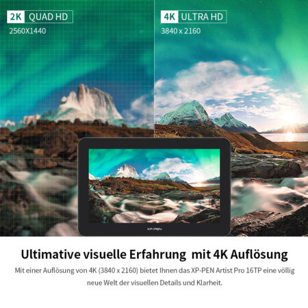 Für mich ist im Bezug auf Grafik immer eine hohe Auflösung wichtig. Und dabei ist mir das XP-Pen Artist Pro 16TP aufgefallen, welches mit einer 4-K Auflösung (3840 x 2160) überzeugen möchte. Dabei ist der offizielle Preis von 899 Euro auf den ersten Blick hoch, aber auf dem zweiten und besonders nach Vergleichen merkt man: Hier steckt viel Technik drin! Und aktuell gibt es das Display zu einem Weihnachtssonderpreis für nur 799 Euro (entspricht 11 % Preissenkung). Über die notwendige Leistung, welche für den Computer benötigt wird, habe ich nicht gefunden. Es wird lediglich Windows 7 oder aufwärts erwähnt. Im Test habe ich mit Windows 11 problemlos gearbeitet.