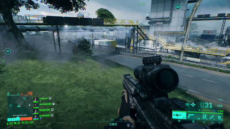Bei der Grafik bin ich ein wenig zwiegespalten, im Spiel ist die Grafik auf der neuen Generation, bei mir speziell der Xbox sehr gut. Die Details der Vegetation und Figuren bis hin zu den Fahrzeugen ist super. Hingegen habe ich beim Start in eine Runde und dem Anflug zum Absetzpunkt ein wenig Bauchschmerzen wenn Gebäude gezeigt werden mit ihren sehr scharf dargestellten Konturen ohne viel Texturen… im Spiel selber verläuft es sich zwar ein wenig, aber es hätten gerne ein paar mehr Unschärfen auf entfernte Gebäude sein dürfen damit diese ein wenig mehr Kontur erhalte und nicht so steril aussehen. Wie gesagt im Spiel selber fällt es im normalen Spielgeschehen weniger aus, besonders wenn Gebäude mit dünneren Wänden neue „Durchgänge“ bekommen wenn eine Granate oder ein Fahrzeug auf Kuschelkurs geht.
