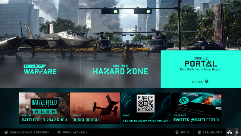 Sobald wir das Hauptmenü erreicht haben stehen uns die Haupt Spielmodi zur Verfügung, den All-Out Warfare, die Hazard Zone und Portal.