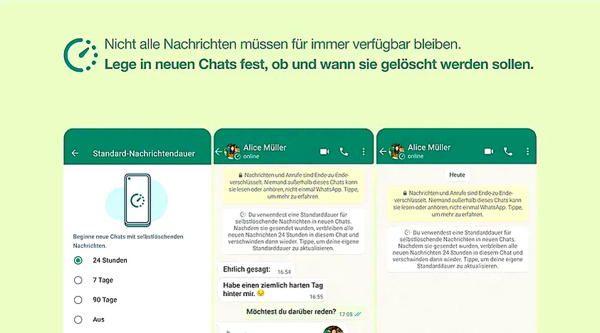 Um die Neuerungen auszuprobieren, öffne die Datenschutz-Einstellungen und wähle dann „Standard-Nachrichtendauer“. Weitere Infos dazu findest du hier.