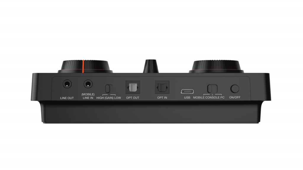 Von außen ähnelt der Sound Blaster GC7 von Creative Technology einem digitalen Mischpult, welches auf die essenziellsten Funktionen reduziert wurde. Zwei stufenlose Drehräder zur intuitiven Konfiguration der Lautstärke sowie des Gamevoice Mix, ein paar vorprogrammierte Tasten im Rahmen der EFX-Steuerung sowie einige selbst konfigurierbare Tasten prägen das oberflächliche Bild des Geräts. Auch eine Taste zur schnellen Stummschaltung des Mikrofons ist vorhanden. Alles wird von einer ansprechenden RGB-Beleuchtung hinterlegt, die das Gerät an die restlichen, häufig in LED-Schein gehüllten Gaminggeräte anpasst. Am Rand des Geräts befinden sich verschiedene Anschlüsse für die Verbindung mit dem PC oder einer Konsole sowie mit mobilen Geräten.
