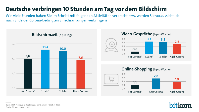 Ob Smartphone, Laptop oder Fernseher: Seit Corona verbringen die Menschen mehr Zeit vor dem Bildschirm. So beträgt die durchschnittliche Bildschirmzeit derzeit 10 Stunden pro Tag, 70 Stunden in der Woche. Dieser Wert ist seit Beginn der Pandemie vor zwei Jahren von damals 8 um 2 Stunden pro Tag gewachsen. Starke Anstiege verzeichnen vor allem Videostreaming, Videotelefonie und Online-Shopping. Knapp ein Viertel der zusätzlichen Bildschirmzeit, im Durchschnitt 24 Minuten pro Tag zusätzlich, werden Videos, Filme oder Serien gestreamt – insgesamt fast eine Stunde am Tag (57 Minuten). Videotelefonate gab es vor der Pandemie so gut wie gar nicht. Gerade einmal 5 Minuten täglich wurde privat per Video telefoniert, jetzt ist es fast eine halbe Stunde (27 Minuten). Auch die Zeit, die man mit Online-Shopping zubringt, hat sich mehr als verdoppelt. Für die Shopping-Tour im Web wird im Schnitt täglich eine Viertelstunde zusätzlich investiert, 24 Minuten sind es unter dem Strich jeden Tag. Das zeigt eine aktuelle repräsentative Befragung von mehr als 1.000 Personen ab 16 Jahren in Deutschland, die im Auftrag des Digitalverbands Bitkom durchgeführt wurde. „In der Corona-Pandemie haben digitale Technologien das Leben am Laufen gehalten, beruflich wie privat. Dabei wächst das Bedürfnis, wieder mehr Zeit in der analogen Welt zu verbringen“, sagt Bitkom-Präsident Achim Berg. So haben sich viele Menschen vorgenommen, ihre Bildschirmzeit nach Ende der Corona-bedingten Einschränkungen auf durchschnittlich 7,6 Stunden pro Tag zu reduzieren und damit unter das Vor-Krisen-Niveau zu bringen. Berg: „Wie auch immer die künftige Entwicklung sein wird: Mehr als jeder fünfte Haushalt (22 Prozent) hat sich auf eine anhaltend intensive Internetnutzung vorbereitet und wegen der Pandemie einen leistungsfähigeren Breitbandanschluss schalten lassen.“