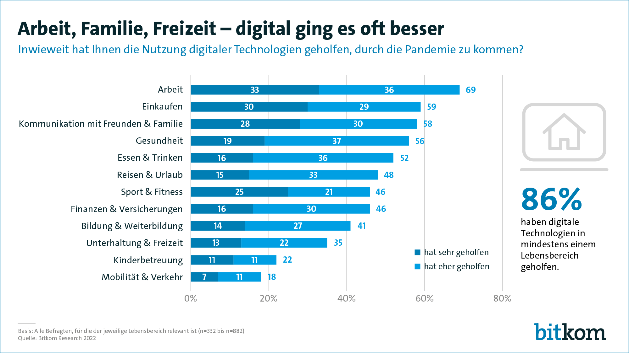 Eine große Mehrheit profitiert während der Pandemie von der Digitalisierung im Alltag. So helfen digitale Technologien 86 Prozent in mindestens einem für sie relevanten Lebensbereich. Ganz oben steht dabei die Arbeit: 7 von 10 Erwerbstätigen (69 Prozent) sind nach eigenem Bekunden dank digitaler Technologien besser durch die Pandemie gekommen. 6 von 10 profitierten beim Einkaufen (59 Prozent) sowie bei der Kommunikation mit Freundeskreis oder Familie (58 Prozent). Für 56 Prozent war Digitales rund um die Gesundheit nützlich, für 52 Prozent bei der Ernährung. 46 Prozent profitierten von digitalen Technologien jeweils bei Sport und Fitness bzw. bei Finanzen und Versicherungen. Im Bereich Bildung und Weiterbildung (41 Prozent) sowie Freizeit und Unterhaltung (35 Prozent) war der empfundene Nutzen etwas geringer. Bei der Kinderbetreuung (22 Prozent) und im Bereich Mobilität und Verkehr (18 Prozent) hat die Digitalisierung nur noch knapp jedem Fünften durch die Pandemie geholfen.