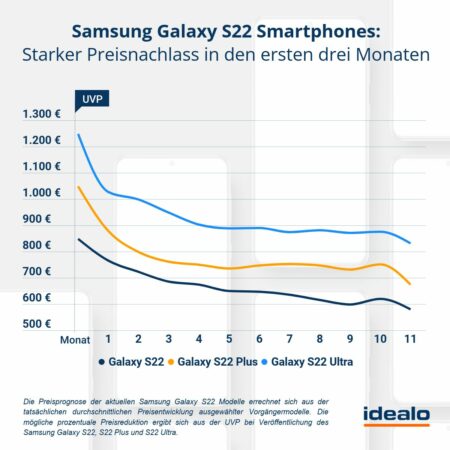 Wer das Smartphone möglichst schnell und günstig erwerben möchte, sollte mindestens 2 Monate abwarten, um spekulativ einen Vorteil zu erhalten. Der Preisverfall wird während des Sommers und Herbstes nicht mehr so hoch sein, wie im April oder Mai. Erst im November ist wieder mit einem stärkeren Abwärtstrend zu rechnen. Wer Geduld hat und bis zum Jahresende wartet, kann beim Kauf des neuen S22 – laut Prognose – sogar bis zu 50% sparen.