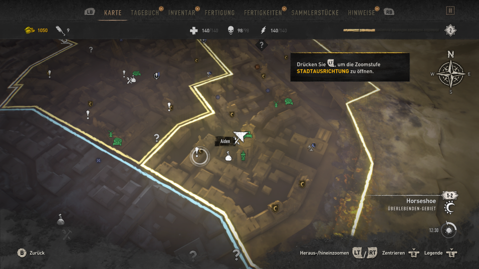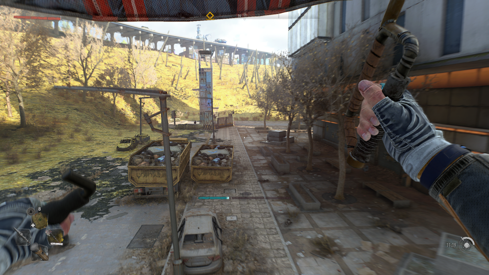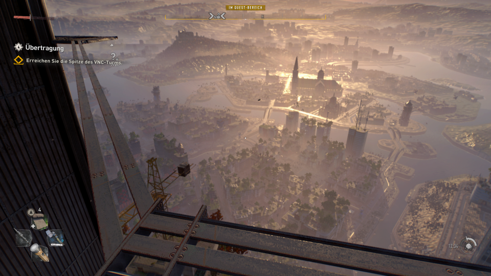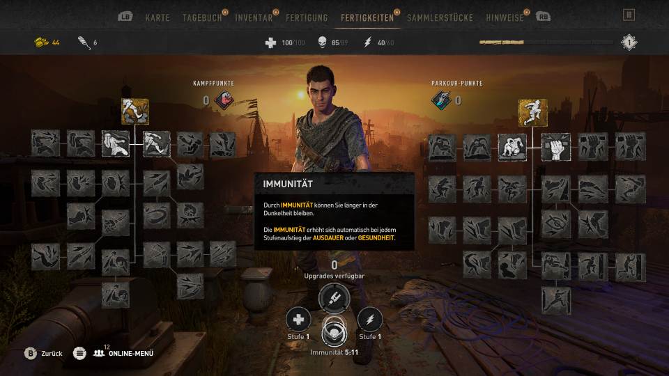 Unseren Weg bestreiten wir den größten Teil zu Fuß. Wie schon im ersten Teil von Dying Light ist auch hier die Fortbewegung durch waghalsige Parkour Einlagen geprägt. Es geht über und durch Häuser, Autodächer, Lüftungsschächte und nutzt so ziemlich jede Gelegenheit euch weiter zu bringen. Leitern, und brüchige Fassaden sind ebenso eine Anhaltspunkt wie Laternen und später auch der ein oder andere Kran. Eure Fähigkeiten für die Fortbewegung schaltet ihr nach und nach durch den Erhalt von Skillpunkten frei. Je mehr Aufgaben, Herausforderungen, Nebenquests und Hauptmissionen ihr erledigt, umso mehr Erfahrungen sammelt ihr für den Bereich Kampf und Parkour.