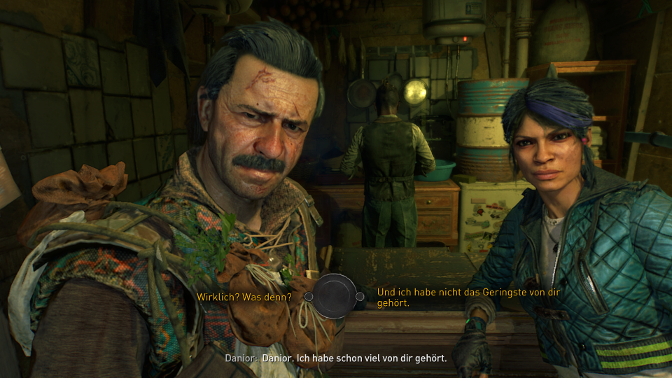 Wir übernehmen die Rolle von Aiden, einem Pilger der in der Post-Apokalypse Abseits der letzten Städte sein Leben bestreitet. Schon zu Beginn bekommen wir eigentlich alle Infos und den eigentlichen Hintergrund der Aiden antreibt durch die Lande zu ziehen… er sucht nach seiner Schwester Mia und dem Verantwortlichen für die damaligen Prozeduren und Untersuchen im Krankenhaus. Die Geschichte ist oberflächlich gesehen nichts Neues… eine verschwundene Schwester, Misshandlungen unter dem Deckmantel der Forschung und ein Virus der den Großteil der Menschheit ausgerottet hat… ABER, so einfach ist das bei Dying Light 2 nicht und die Geschichtenschreiber haben sich eine Menge Mühe gegeben die Stadt Villedor mit Leben und vor allem mit viel Hintergrund und Nebenquests zu füllen.