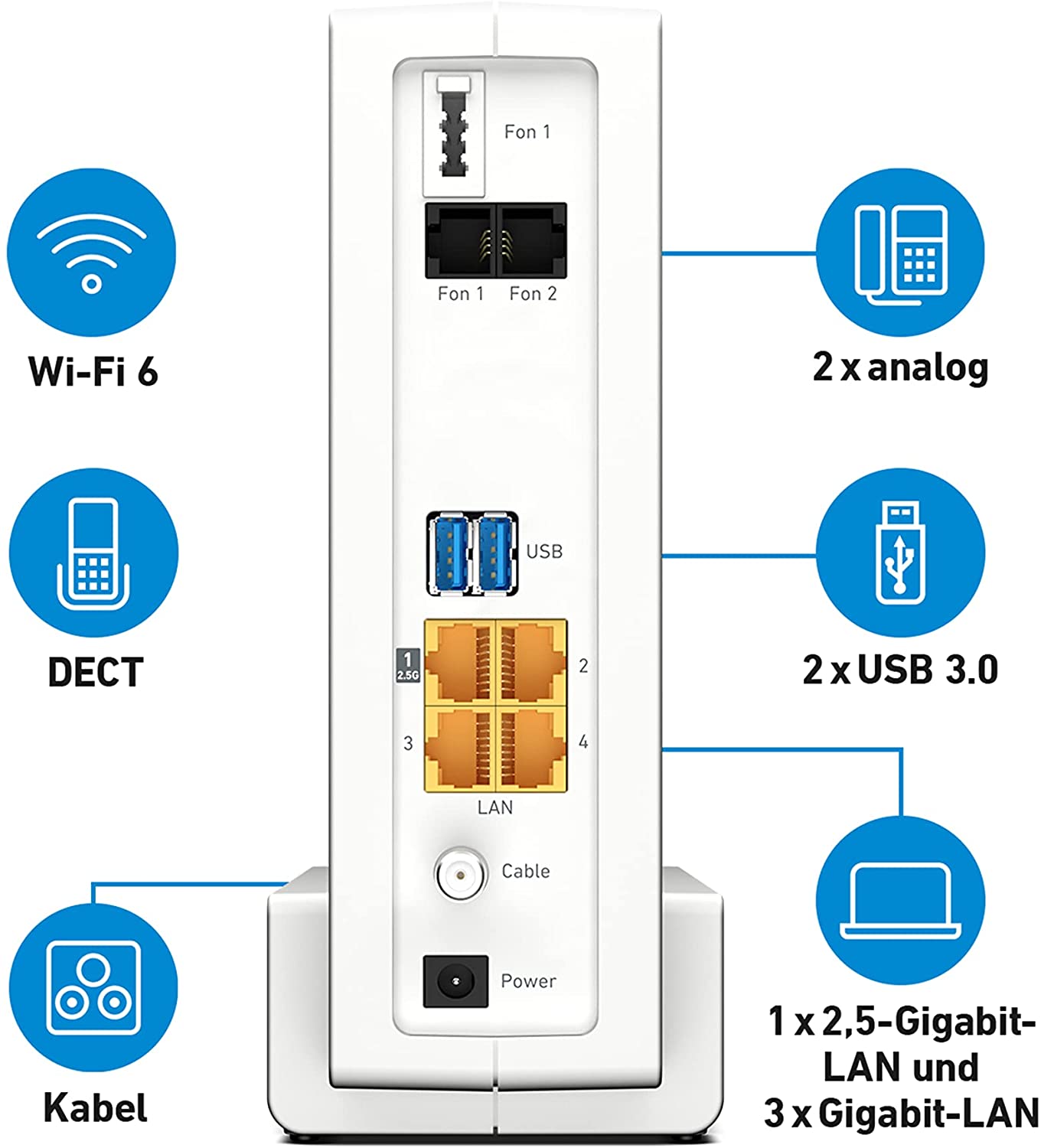 An Bord hat die FRITZ!Box 6690 Cable einen Router, ein Kabelmodem und DECT. Dank DOCSIS 3.1 erreicht sie Geschwindigkeiten von bis zu 6 GBit/s im Downstream und 2 GBit/s im Upstream. Zudem verfügt die Box über einen 2,5-Gigabit- und drei Gigabit-LAN-Ports. Auch zwei USB-3.0-Anschlüsse sind vorhanden, über die man seine Speichermedien oder auch Drucker in das Netzwerk einbinden kann.