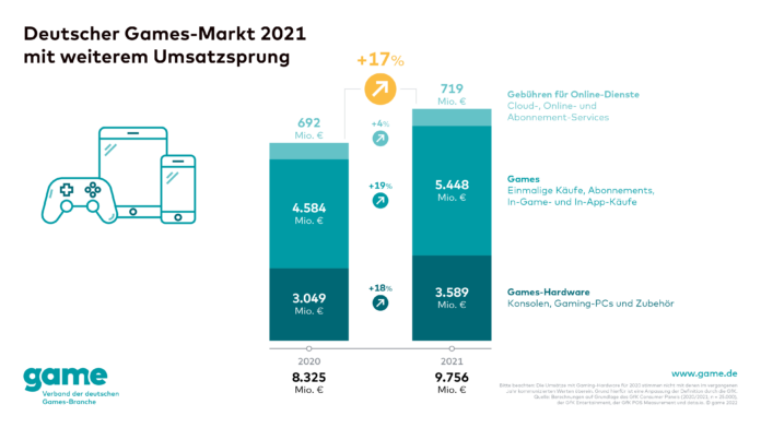 Der deutsche Games-Markt konnte nach dem historischen Wachstumssprung 2020 auch im Folgejahr deutlich zulegen: So wurden 2021 mit Games, Gebühren für Online-Dienste sowie Games-Hardware rund 9,8 Milliarden Euro umgesetzt. Das ist ein Plus von 17 Prozent im Vergleich zum Vorjahr. Bereits 2020 konnte der deutsche Games-Markt um 32 Prozent wachsen, was unter anderem an neuen Spielerinnen und Spielern lag, die während der Corona-Pandemie hinzugekommen waren. Das gab heute der game – Verband der deutschen Games-Branche auf Basis von Daten der Marktforschungsunternehmen GfK und data.ai bekannt. Die Nachfrage nach Gaming-Hardware, vor allem nach Spielekonsolen (+23 Prozent) und Zubehör für Spiele-PCs (+22 Prozent), sowie In-Game- und In-App-Käufe (+30 Prozent) waren die größten Wachstumsmotoren.