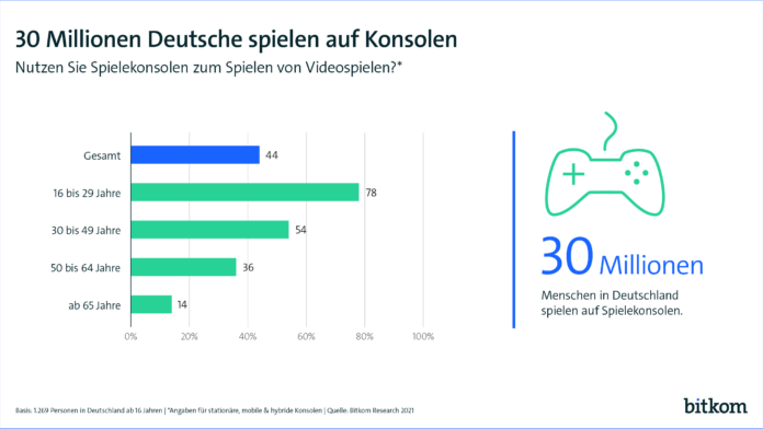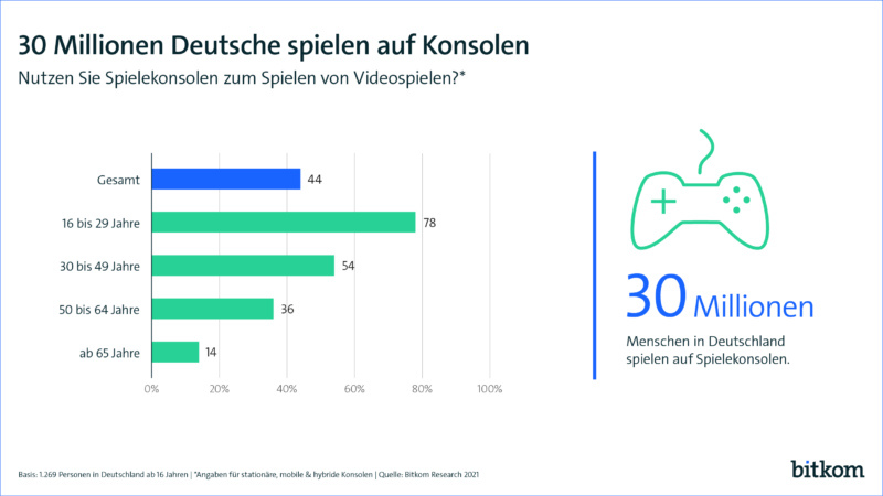 Ob PlayStation, Xbox oder Switch – Spielekonsolen sind fester Bestandteil der heutigen Gaming-Welt. Bereits die Hälfte derjenigen, die zumindest hin und wieder Computer- und Videospiele spielen, nutzt dazu eine stationäre Konsole (52 Prozent), jede und jeder Fünfte (22 Prozent) spielt auf mobilen Konsolen und fast 4 von 10 Gamerinnen und Gamern (38 Prozent) spielen auf hybriden Konsolen, die sowohl stationär als auch mobil verwendet werden können. Das zeigt eine Studie im Auftrag des Digitalverbands Bitkom, die im Sommer 2021 durchgeführt wurde. Befragt wurden mehr als 1.200 Menschen in Deutschland ab 16 Jahren. „Spielekonsolen sind in deutschen Haushalten keine Seltenheit. Eine große Auswahl an Spielen sowie eine breite Palette an Zubehör wie bewegungsgesteuerte Controller, Fitness-Gadgets oder VR-Brillen tragen zu einem abwechslungsreichen Spieleerlebnis bei“, erklärt Dr. Sebastian Klöß, Bitkom-Experte für Consumer Technology. „Zudem sind moderne Konsolen wahre Multifunktionsgeräte und werden längst nicht mehr nur zum Spielen genutzt. Viele streamen darüber Filme, Serien und Musik oder integrieren sie ins Sportprogramm.“