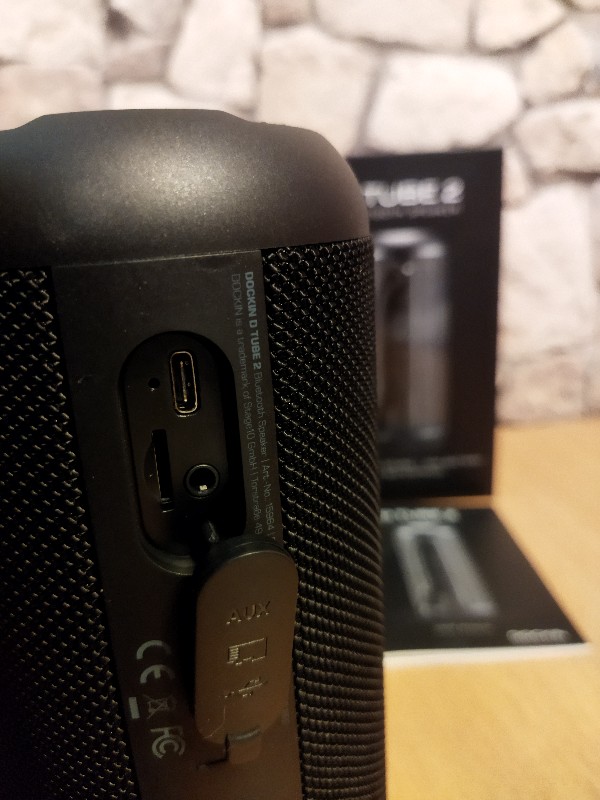 Zum Aufladen oder anschließen einer Audioquellen über Kabel hat der DOCKIN D Tube 2 eine wassergeschützte kunstoffblende die ihr einfach öffnen könnt. Hinter der Klappe versteckt sich neben den Anschlüssen ein zusätzlicher Slot für eine SD Karte zum abspielen eurer Musik ohne Bluetooth Gerät.