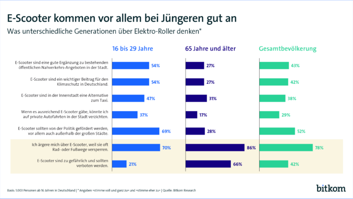 E-Scooter gehören seit drei Jahren zum Bild vieler deutscher Städte, aber an den elektrisch angetriebenen Tretrollern scheiden sich immer noch die Geister. 43 Prozent der Bundesbürgerinnen und Bundesbürger halten E-Scooter, die seit dem 15. Juni 20219 legal in Deutschland genutzt werden dürfen, für eine gute Ergänzung zu bestehenden öffentlichen Nahverkehrsangeboten in der Stadt. Unter den 16- bis 29-Jährigen sagt dies sogar eine Mehrheit (54 Prozent), unter den Älteren ab 65 Jahren sind es mit 27 Prozent nur halb so viele. Das sind Ergebnisse eine Befragung von 1.003 Personen ab 16 Jahren in Deutschland im Auftrag des Digitalverbands Bitkom. 42 Prozent aller Befragten sehen in E-Scootern einen wichtigen Beitrag zum Klimaschutz. Bei den Jüngeren liegt der Anteil mit 54 Prozent ebenfalls deutlich über dem der Älteren (27 Prozent). Für fast die Hälfte der Jüngeren (47 Prozent) sind E-Scooter zudem eine Alternative zum Taxi in der Innenstadt (Gesamtbevölkerung: 38 Prozent, Ältere: 31 Prozent). Und ein Drittel der 16- bis 29-Jährigen (37 Prozent) gibt an, bei einem ausreichenden E-Scooter-Angebot auf private Autofahrten in der Stadt verzichten zu können (Gesamtbevölkerung: 29 Prozent, Ältere: 17 Prozent). „E-Scooter haben bewiesen, dass sie mehr sind als ein kurzlebiger Hype. Elektroroller zur Kurzleihe per Smartphone gehören inzwischen ebenso zu unserem Alltag wie der privat gekaufte E-Scooter für den regelmäßigen Weg zur Arbeit“, sagt Nils Heller, Referent Mobility beim Bitkom. „Unsere Mobilität muss sich mit Blick auf Klimaschutz und Nachhaltigkeit grundsätzlich verändern. E-Scooter können dazu einen Beitrag leisten – gerade in Verbindung mit digitalen Technologien, die eine Vernetzung mit den bestehenden ÖPNV-Angeboten und verschiedenen Verkehrsmitteln ermöglichen.“