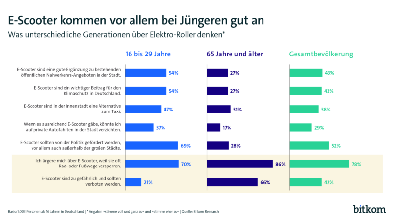 Weit verbreitet ist quer durch alle Altersgruppen der Ärger über achtlos abgestellte E-Scooter. So sagen 85 Prozent, dass E-Scooter die Innenstadt verunstalten, und 78 Prozent ärgern sich über E-Scooter, die oft Rad- und Fußgängerwege versperren. „Um das Park-Problem einzudämmen, können Städte und Kommunen zum Beispiel in Mikromobilitätsparkplätze investieren oder Qualitätskriterien für Anbieter festlegen, etwa zur Sicherheit und Nachhaltigkeit“, sagt Nils Heller, Mobility-Experte beim Bitkom. „Die Unternehmen sind hier durchaus bereit, Verantwortung zu übernehmen. Zudem können die Smartphone-Apps der Anbieter genutzt werden, um den Nutzerinnen und Nutzern Anreize für ordnungsgemäßes Verhalten zu bieten.“ 42 Prozent sind der Meinung, E-Scooter seien zu gefährlich und sollten verboten werden. Bei dieser Frage gibt es allerdings deutliche Unterschiede zwischen den Altersgruppen: Während zwei Drittel (66 Prozent) der Seniorinnen und Senioren für ein Verbot plädieren, so sind es unter den 16- bis 29-Jährigen gerade einmal 21 Prozent. Eine knappe Mehrheit wünscht sich mehr Unterstützung der Politik für das neue Mobilitätsangebot. 52 Prozent wollen, dass E-Scooter vor allem auch außerhalb der großen Städte gefördert werden – bei den Jüngeren sind es 69 Prozent, bei den Älteren nur 28 Prozent.