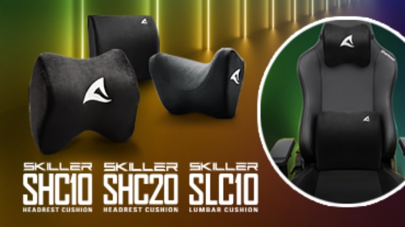 Die beiden Kopfkissen SKILLER SHC10 und SKILLER SHC20 lassen sich mit einem Handgriff per verstellbarem Band am Kopfende eines Gaming-Stuhls mit hoher Rückenlehne anbringen und sollen gerade bei längeren Gaming-Sitzungen den Nacken effizient entlasten. Während das SHC10 eine klassische Form aufweist, soll sich das SHC20 durch seine U-Form auch als Reisekissen mit zusätzlicher Stützwirkung in jeder Kopfposition eignen.