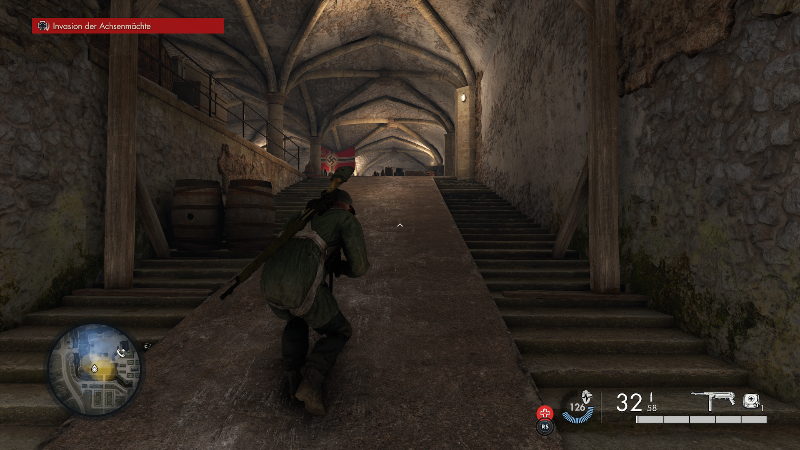 Invasion der Achsenmächte, hört sich nach einer zusätzlichen Herausforderung an und da hast du Recht. Dabei kommen aber keine weiteren NPC Truppen, sondern ein Spieler… ein Spieler, der dir die Suppe versalzen möchte. Ausgerüstet mit allem was nötig ist dich zu stören. Mit Sniper, Pistole, MP, Granaten und Fernglas geht er jetzt auf die Jagd nach dir. In den ersten Minuten weiß noch keiner wo der andere sich herumtreibt, außer man sieht seinen Kontrahenten durch Zufall. Nachdem man also eventuell etwas planlos umher gerannt ist, lässt sich über die Telefone die temporäre Position des Gegners bestimmen und an jetzt beginnt die Jagd.