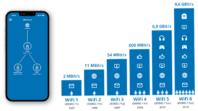 Die All-In-One-Lösung für perfektes WLAN sind Powerline-Adapter. Der Trick: Sie nutzen den hauseigenen Stromkreislauf wie ein langes Datenkabel. Der Vorteil: Wände, Stahlbetondecken und sogar Fußbodenheizungen stellen kein Hindernis mehr dar, weil es eine kabelbasierte Lösung ist. An jeder Wandsteckdose steht mit WLAN-Powerline-Adaptern ein schneller Hotspot zur Verfügung. Die Installation ist denkbar einfach: einstecken, kurz warten und loslegen. Aktuelle Modelle verbinden die beste Mesh-WLAN- mit der schnellsten Powerline-Technik. Der mehrfache Testsieger devolo Magic 2 WiFi 6 schafft eine rasante Powerline-Geschwindigkeit von maximal 2.400 Mbit/s und bietet Mesh-WLAN für ein schnelles Funknetz im ganzen Zuhause.