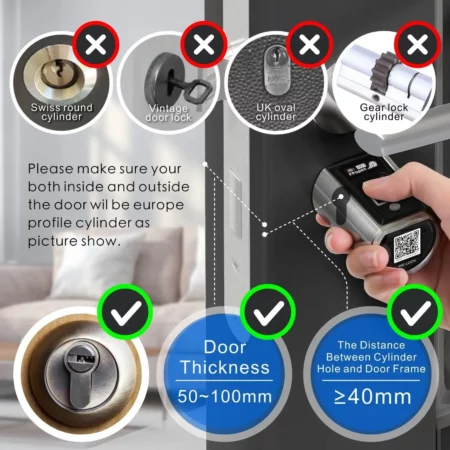 - Europäischer Standardverriegelungszylinder:Geeignet für alle Türen mit einer Dicke zwischen 70 mm und 110 mm. Einfach, den vorhandenen Schlosszylinder in Ihrer Haustür oder Wohnungstür ohne Bohren zu ersetzen.