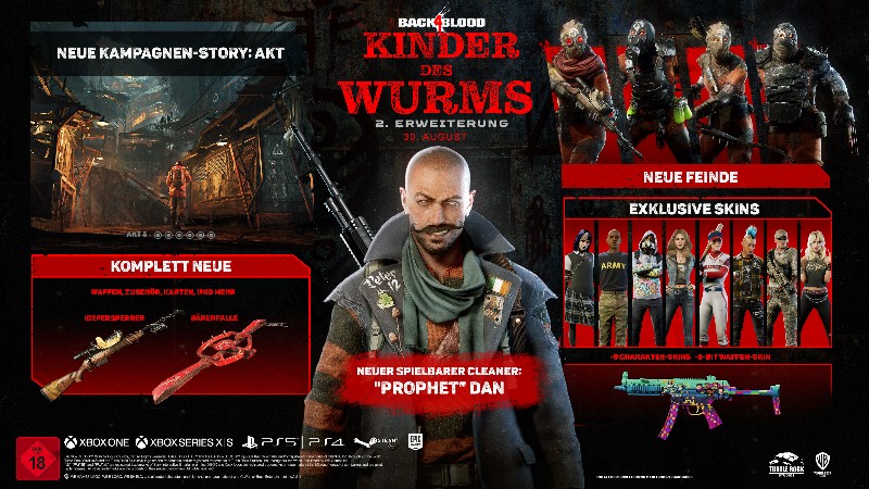 Warner Bros. Games und Turtle Rock Studios haben heute Details zur nächsten Back 4 Blood-Erweiterung bekannt gegeben, die offiziell den Namen Kinder des Wurms trägt. Der kommende DLC wird voraussichtlich am 30. August 2022 als Teil des Back 4 Blood Annual Pass, der Back 4 Blood: Deluxe Edition und Back 4 Blood: Ultimate Edition, oder als separater Kauf erscheinen.