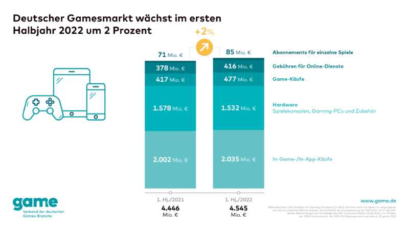 Der deutsche Games-Markt bekommt Gegenwind zu spüren: Nachdem der Umsatz mit Games und entsprechender Hardware in den vergangenen Jahren stark gestiegen ist, hat sich das Wachstum im ersten Halbjahr 2022 deutlich abgeschwächt. Wuchs in den ersten sechs Monaten 2021 der deutsche Games-Markt noch um 22 Prozent, waren es im gleichen Zeitraum ein Jahr später nur noch 2 Prozent. Danach betrug der Umsatz mit Computer- und Videospielen sowie Games-Hardware in den ersten sechs Monaten 2022 rund 4,5 Milliarden Euro. Das gab heute der game – Verband der deutschen Games-Branche auf der Pressekonferenz der gamescom bekannt. Das weltgrößte Games-Event findet in der kommenden Woche auch wieder vor Ort in Köln statt. Basis der Daten sind Erhebungen der Marktforschungsunternehmen GfK und Data.ai. Die Wachstumstreiber der Vorjahre wie der Umsatz mit Spiele-Apps sind im ersten Halbjahr 2022 sogar gesunken. So wurden mit In-App-Käufen 1,3 Milliarden Euro umgesetzt und damit rund 7 Prozent weniger als noch vor einem Jahr. Besonders stark gewachsen ist dagegen der Umsatz mit In-Game-Käufen bei PC- und Konsolenspielen. Dieser Teilmarkt wuchs im Vergleich zum Vorjahreszeitraum um 24 Prozent auf 705 Millionen Euro. Auch mit Abonnements für einzelne Spiele (+19 Prozent auf 85 Millionen Euro) und Gebühren für Online-Dienste (+10 Prozent auf 416 Millionen Euro) konnten die Umsatzverluste aus anderen Bereichen aufgefangen werden. Im Bereich der Spiele-Hardware konnte auch aufgrund der weiter anhaltenden Lieferengpässe einzig das Segment der Spiele-PCs und -Laptops wachsen. Hier stieg im ersten Halbjahr 2022 der Umsatz um 10 Prozent auf 479 Millionen Euro.