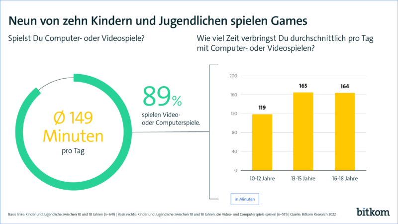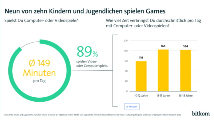 Ob an Smartphone, Computer oder Konsole: Kinder und Jugendliche in Deutschland verbringen ihre freie Zeit gerne mit Gaming. 89 Prozent der 10- bis 18-Jährigen spielen Computer- oder Videospiele und investieren dafür im Schnitt zwei Stunden und 29 Minuten pro Tag – am Wochenende liegt der Wert noch einmal deutlich höher. Das ist das Ergebnis einer repräsentativen Befragung im Auftrag des Digitalverbands Bitkom unter 641 Kindern und Jugendlichen in Deutschland zwischen zehn und 18 Jahren. Demnach spielen 70 Prozent mehr als eine Stunde täglich, 15 Prozent zwischen einer Viertel- einer vollen Stunden und nur fünf Prozent maximal eine Viertelstunde am Tag. „Games sind ein fester Bestandteil im Alltag vieler Kinder und Jugendlicher“, erklärt Bitkom-Hauptgeschäftsführer Dr. Bernhard Rohleder. „Es ist wichtig, einen geregelten Umgang mit Video- und Computerspielen zu üben. Eltern sollten gemeinsam mit ihren Kindern ein wöchentliches Zeitbudget vereinbaren oder insbesondere bei jungen Kindern eine tägliche Höchstgrenze festlegen.“