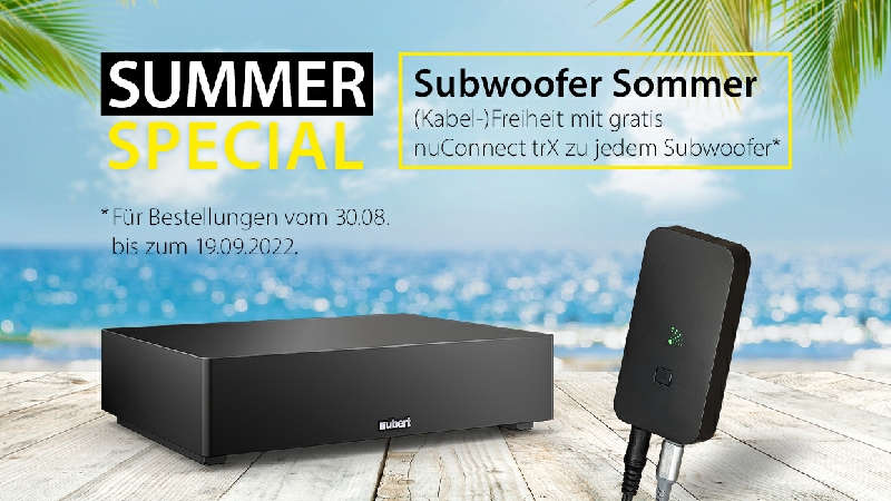 Subwoofer Sommer! Vom 30.8.-19.9.2022 geht das Summer Special von Nubert in die letzte Runde. Den beliebten Bassisten der nuSub-Serie legen die Schwaben den Funkadapter nuConnect trX bei, damit Signalkabel endgültig der Vergangenheit angehören.