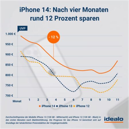 Auch beim iPhone 14 Pro Max kann nach etwa 6 Monaten mit einer Ersparnis von 186 Euro gerechnet werden. Das entspricht in etwa 13%. Nach 7 Monaten sinkt der Preis sogar um 14%. Die Ersparnis liegt dann bei etwa 197 Euro.