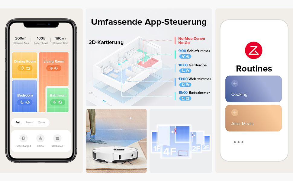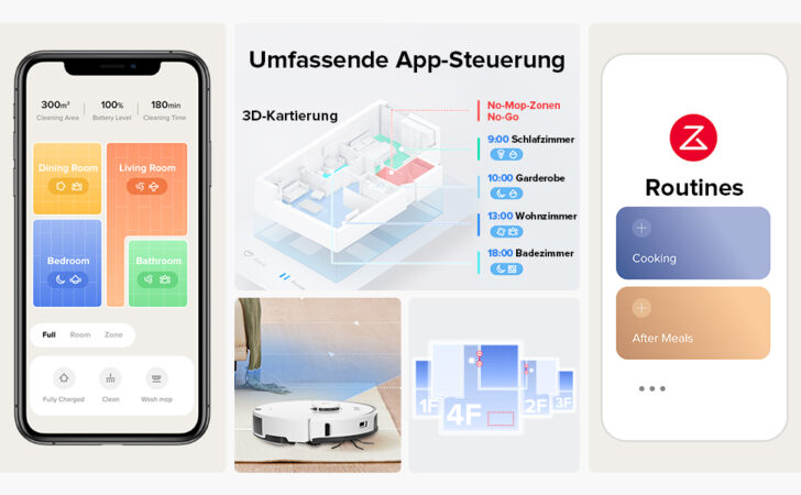 Wer mag, kann seine Räume nun maßgeschneidert säubern lassen. Denn auf Wunsch kann die Reinigung der Böden für jeden Raum individuell angepasst werden. So kann in der Küche mit hoher Intensität geschrubbt werden, während man im Flur nur den normalen Wisch- und Saugmodus bemüht.