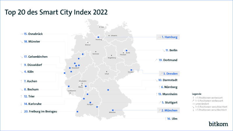 Hamburg gewinnt erneut, büßt aber stark an Vorsprung ein, München holt mit hohem Tempo auf, Dresden schafft es erstmals aufs Treppchen und insgesamt können nahezu alle Nachzügler Boden gut machen: Das sind Ergebnisse des Smart City Index, den der Digitalverband Bitkom 2022 zum vierten Mal erhoben hat. Hamburg verteidigt den Titel mit 86,1 von 100 möglichen Punkten, unmittelbar dahinter liegt nun erstmals München mit 85,3 Punkten auf Rang 2, das Podium komplettiert Dresden mit etwas Abstand und 81,6 Punkten. Für beide Verfolger geht es zwei beziehungsweise drei Plätze nach oben. Dafür fallen das im Vorjahr zweitplatzierte Köln (4., 79,4 Punkte) und das 2021 drittplatzierte Karlsruhe (14., 73,5 Punkte) aus den Podiumsrängen. Die Top 10 sind eng zusammengerückt. Zwischen Platz 4 und 10 liegen nur 4,1 Punkte. Neu unter den besten Zehn sind Nürnberg (6., 77,6 Punkte), Aachen (7., 77,3 Punkte) und Düsseldorf (9., 76,6 Punkte). Für diese drei Städte geht es jeweils zehn Plätze nach oben. Die Top 10 komplettieren Stuttgart (5., 78,1 Punkte), Bochum (8., 77,0 Punkte) und Darmstadt (10., 75,3 Punkte).