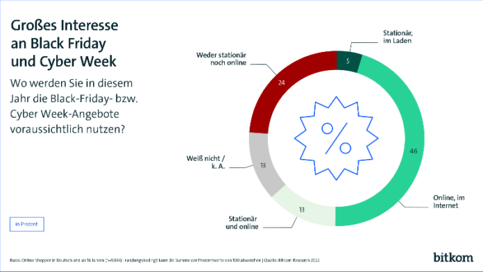 Der bevorstehende Black Friday und die darauffolgende Cyber Week sind für einen Großteil ein willkommener Anlass für eine Einkaufstour im Internet. 64 Prozent der Online-Shopper wollen die entsprechenden Angebote in diesem Jahr nutzen und auf Schnäppchenjagd gehen – davon 46 Prozent im Netz und 5 Prozent im stationären Handel. 13 Prozent wollen sowohl stationär als auch online Black-Friday-Angebote wahrnehmen. Weitere 13 Prozent sind noch unentschlossen. Für 24 Prozent spielen Black Friday und die Cyber Week keine Rolle. Handels- und Aktionstage wie Black Friday oder die Cyber Week sind die umsatzstärksten Tage im Online-Handel.