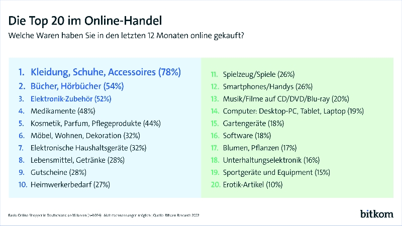 Und was kaufen die Deutschen am liebsten im Internet? Auch danach wurde in der Studie gefragt. Die Top 3 sind Kleidung, Bücher und Elektronik. In Zahlen: Kleidung, Schuhe und Accessoires haben 78 Prozent in den letzten 12 Monaten online geshoppt. Dahinter folgen Bücher und Hörbücher (54 Prozent) sowie Elektronik-Zubehör (52 Prozent), Medikamente (48 Prozent) und Kosmetik, Parfum und Pflegeprodukte (44 Prozent). Auf den Plätzen 5 bis 10 finden sich Artikel aus dem Bereich Möbel, Wohnen, Dekoration (32 Prozent), elektronische Haushaltsgeräte (32 Prozent), Lebensmittel und Getränke (28 Prozent), Gutscheine (28 Prozent) sowie Heimwerkerbedarf (27 Prozent). Insgesamt gibt es wohl nichts, was nicht online den Besitzer oder die Besitzerin wechselt: 17 Prozent haben in den vergangenen 12 Monaten Blumen oder Pflanzen online bestellt, zehn Prozent Erotik-Artikel und 3 Prozent sogar ein Auto und dabei den gesamte Kauf online abgewickelt.