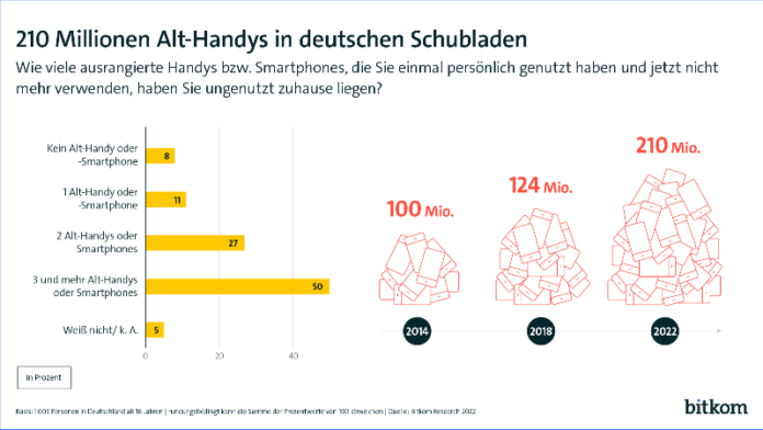 Mit den Alt-Geräten liegt nicht nur eine große Menge Kunststoff und Glas in den Schubladen und Schränken herum, sondern auch zahlreiche wertvolle Rohstoffe. Beispiel Alt-Handys und Smartphones: Neben ca. 6600 Tonnen Aluminium, dessen Ausgangsstoff Bauxit von der EU als kritischer Rohstoff eingestuft ist, finden sich in den 210 Millionen Geräten große Mengen der ebenfalls kritischen Rohstoffe Kobalt (ca. 1400 Tonnen), Lithium (ca. 180 Tonnen), Magnesium (ca. 140 Tonnen), Titan (ca. 60 Tonnen) sowie Phosphor, Tantal, Platin-Metalle oder Seltene Erden. In vergleichsweiser kleiner Menge, aber umso wertvoller: Gold ist mit einem geschätzten Gewicht von 3 Tonnen in den 210 Millionen deutschen Alt-Handys und Alt-Smartphones vorhanden. Insgesamt besteht ein Smartphone aus rund 60 verschiedenen Komponenten. „Die Herstellung eines Smartphones benötigt viele Rohstoffe, Energie und Ressourcen. Werden sie länger genutzt, wirkt sich dies positiv auf ihren ökologischen Fußabdruck aus“, betont Rohleder. „Die Deutschen horten einen riesigen Rohstoffschatz. Auch vor dem Hintergrund immer wieder neu unterbrochener Lieferketten ist wichtig, dass wir die schon vorhandenen Rohstoffe in den Haushalten nicht brach liegen lassen.“