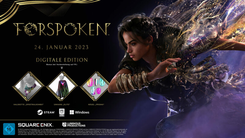 Wer Forspoken digital für PC via Steam, Microsoft Store oder Epic Games Store vorbestellt, erhält die Halskette „Spektralkombo“, den Umhang „Elite“ und die Nägel „Prisma“, die Frey auf ihrer Reise durch Athia ausrüsten kann.