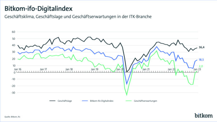 In der Digitalbranche laufen die Geschäfte weiterhin deutlich besser als in der Gesamtwirtschaft und erstmals seit letzten Sommer werden auch die Aussichten wieder überwiegend positiv bewertet. Die aktuelle Geschäftslage der IT- und Telekommunikationsunternehmen liegt im Januar bei 36,4 Punkten und damit 1,2 Punkte höher als noch im Dezember. Die Geschäftserwartungen für die kommenden Monate verbessern sich nach einem kräftigen Anstieg zum Jahresende noch einmal und klettern von -0,6 auf 2,0 Punkte. Das zeigt der Bitkom-ifo-Digitalindex. Der Index bildet die aktuelle Geschäftslage und die Geschäftserwartungen für die kommenden drei Monate ab und berechnet daraus das Geschäftsklima. Dieses liegt nun bei 18,5 Punkten, nach 16,6 Punkten im Dezember und nur 5,9 Punkten im November. „Die Zeichen in der Digitalbranche stehen wieder auf Wachstum. Das ist eine gute Nachricht für den Standort Deutschland insgesamt, denn mit 1,35 Millionen Beschäftigten sind die IT- und Telekommunikationsunternehmen ein bedeutender Arbeitgeber“, sagt Bitkom-Präsident Achim Berg.