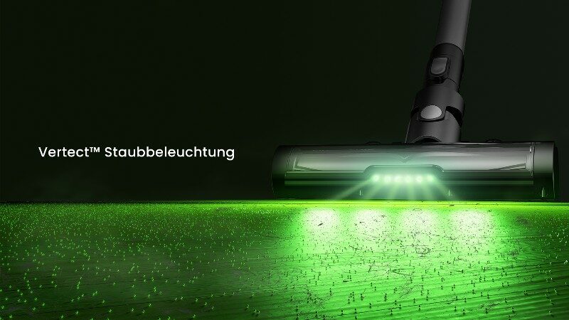 Die Vertect-Beleuchtung ist sozusagen ein zusätzliches Schmankerl auf dem ohnehin schon leistungsstarken Sauger, denn mithilfe des grünen Lichts werden selbst unsichtbare Staubpartikel aufgedeckt und gleich darauf entsorgt. Diese feinen Partikel geraten dank des 5-stufigen Filtersystems nicht wieder zurück in die Atemluft, sondern verbleiben in den Filtern zurück. Allergiker profitieren enorm davon, denn die vom Lüfter ausgestoßene Luft ist zu 99,99 % frei von Allergenen.