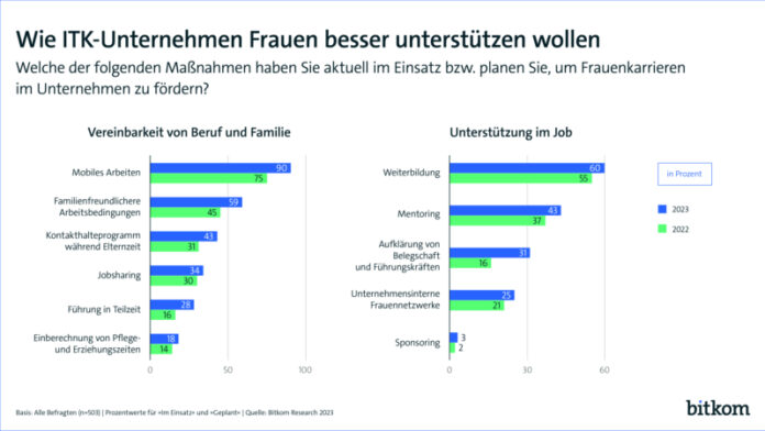 Aber auch Frauen, die bereits in ITK-Unternehmen arbeiten, werden verstärkt gefördert. Dabei wird der besseren Vereinbarkeit von Beruf und Familie ein besonderer Stellenwert beigemessen: 9 von 10 Unternehmen (90 Prozent) ermöglichen oder planen mobiles Arbeiten, um Frauenkarrieren im Unternehmen zu fördern (2022: 75 Prozent), 6 von 10 Unternehmen (59 Prozent) setzen generell auf familienfreundliche Arbeitsbedingungen wie zum Beispiel flexible Arbeitsmodelle (2022: 45 Prozent). Führung in Teilzeit bieten inzwischen bereits 28 Prozent an oder planen dies zu tun (2022: 16 Prozent). Darüber hinaus planen oder nutzen 60 Prozent der ITK-Unternehmen Weiterbildungsangebote, um Frauen zu fördern (2022: 55 Prozent) und 43 Prozent Mentoringprogramme (2022: 37 Prozent). „In der Digitalbranche wächst das Bewusstsein für den enormen Stellenwert der Frauenförderung. Die steigende Zahl ergriffener Maßnahmen zeigt, wir sind auf dem Weg, auch wenn wir das Tempo deutlich steigern müssen“, sagt Dehmel.