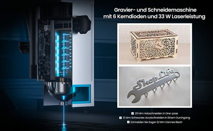 Was die Gravur und den Schnitt betrifft, hat uns der X30 Pro tief beeindruckt. Die Menge und Unterschiedlichkeit der nutzbaren Materialien ist hervorragend und es gilt sozusagen das bekannte Motto, dass nichts unmöglich ist. Das gilt beim Wort zu nehmen. Die Kombination aus Materialen in Verbindung mit der Kombination aus Gravur und Schnitt lässt erahnen, dass der X30 Pro für alle ästhetischen oder nützlichen Werkstücke geeignet ist. Mit seiner Leistung, Präzision, Effizienz und Arbeitsfläche ist er ein Glanzstück unter den Lasergravierern und kann deshalb nur empfohlen werden. Vor allem mit den von Atomstack angebotenen Erweiterungen, wie z. B. dem Modul für zylindrische Objekte, eröffnet sich eine noch größere, tiefgründige Welt an Möglichkeiten.