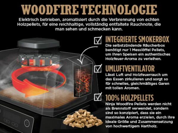 Der Ninja Woodfire kann aber nicht nur grillen. Er ist mit 6 Kochfunktionen ausgestattet, die neben dem Grillen und Smoken auch das Frittieren mit Heißluft, das Braten, Backen sowie das Aufwärmen und sogar Dörren umfassen. Ein wahrer Allrounder also, der alle Bedürfnisse abdeckt. Mit einer Temperatur von bis zu 260 Grad ist er übrigens mehr als ausreichend für jede Zubereitung ausgestattet.