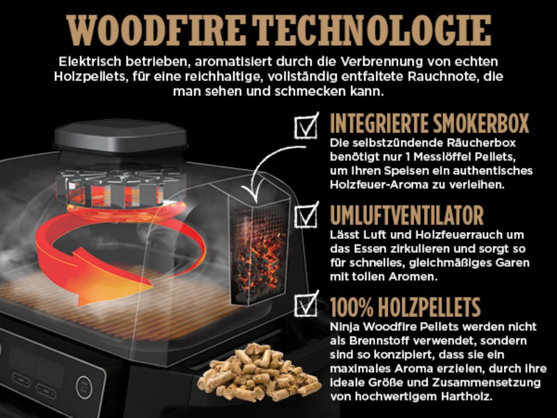 Der Clou am Woodfire ist nicht nur die viel kürzere Zubereitung, sondern auch der authentische Rauchgeschmack, der das Essen wahrhaftig köstlich macht. Man braucht nun keinen Smoker als Trailer hinter dem Pickup mehr, sondern hat das gleiche Aroma in bester Qualität immer mit sich.