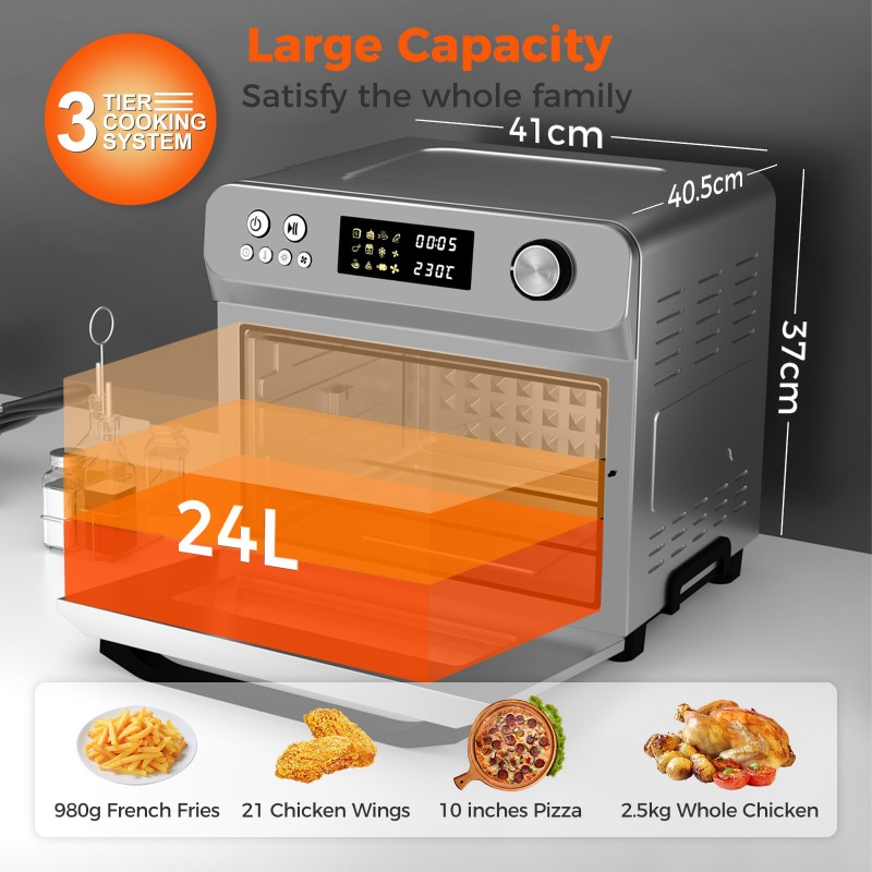 Der Innenraum bietet Platz für 3 Einschübe oder einen Drehspieß und viele Heißluftfritteusen haben zum Beispiel das Problem, dass die Portionen eher für zwei Personen ausgelegt sind oder gerade was für den hohlen Zahn, wenn man vier Mäuler stopfen muss.