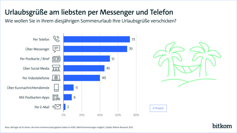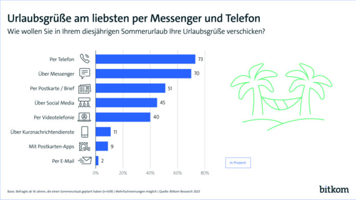 „Das Wetter ist schön und das Essen ist gut.“ – Grüße aus dem Urlaub gehören für die meisten fest zur Auszeit dazu. Dabei überbringen die deutschen Sommerurlauberinnen und -urlauber diese am häufigsten per Telefon (73 Prozent) und per Messenger (70 Prozent). Während in der Altersgruppe zwischen 16 und 29 Jahren mit 73 Prozent ähnlich viele zum Telefon greifen wie in der Gruppe ab 65 Jahren (76 Prozent), nutzen die Jüngeren Messenger mit 85 Prozent wesentlich stärker als die Älteren (32 Prozent), um ihre Urlaubsgrüße zu überbringen. Trotzdem ist aber auch der Klassiker der Urlaubspost noch längst nicht tot: 51 Prozent derjenigen, die dieses Jahr einen Sommerurlaub geplant haben, wollen ihre Urlaubsgrüße per Postkarte oder Brief verschicken. Unter den 16- bis 29-Jährigen greifen mit 50 Prozent sogar ähnlich viele noch zum Stift wie unter den ab 65-Jährigen (55 Prozent). Das sind Ergebnisse einer Befragung im Auftrag des Digitalverbands Bitkom unter 1.002 Personen in Deutschland ab 16 Jahren, darunter 639, die in diesem Jahr einen Sommerurlaub geplant haben.