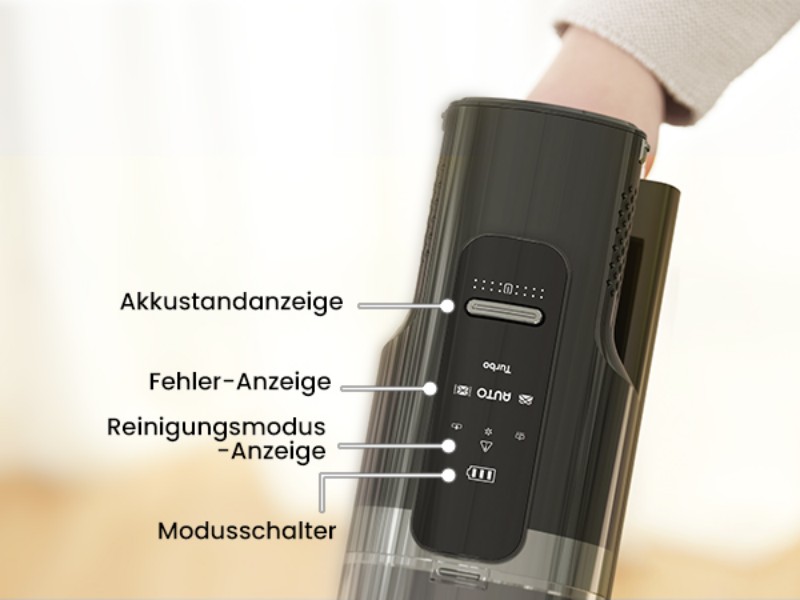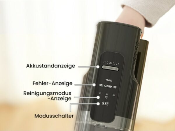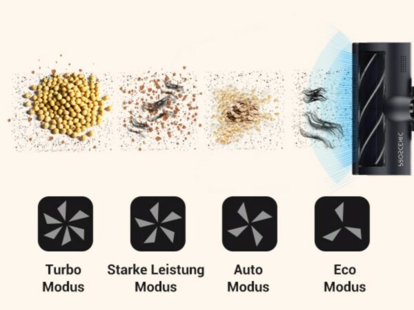 Die vier unterschiedlichen Modi sind hier vor allen anderen Dingen nennenswert. Sie heißen Turbo-Modus, Starke-Leistung-Modus, Auto-Modus und Eco-Modus. Zwischen ihnen kann man ohne Einschränkungen hin und her wechseln. Die Bezeichnungen an sich sprechen schon für sich, aber hier nochmal ausführlich: der Turbo-Modus aktiviert die volle Power des DustZero, sodass er mit allen 30.000 Pa loslegt. Der Starke-Leistung-Modus eignet sich für besonders viel Staub anstatt große Krümel. Der Auto-Modus stellt sich selbstständig ein, je nachdem, wieviel Kraft aufgewendet werden muss. Und der Eco-Modus ist der Standard-Betrieb, akkuschonend und leiser als die anderen Modi. Diese vier Einstellungen reichen völlig aus, um jeder Verschmutzung problemlos entgegenzuwirken. Selbst hartnäckige Stellen sind kein Problem mehr, der DustZero S3 entfernt sie zuverlässig.