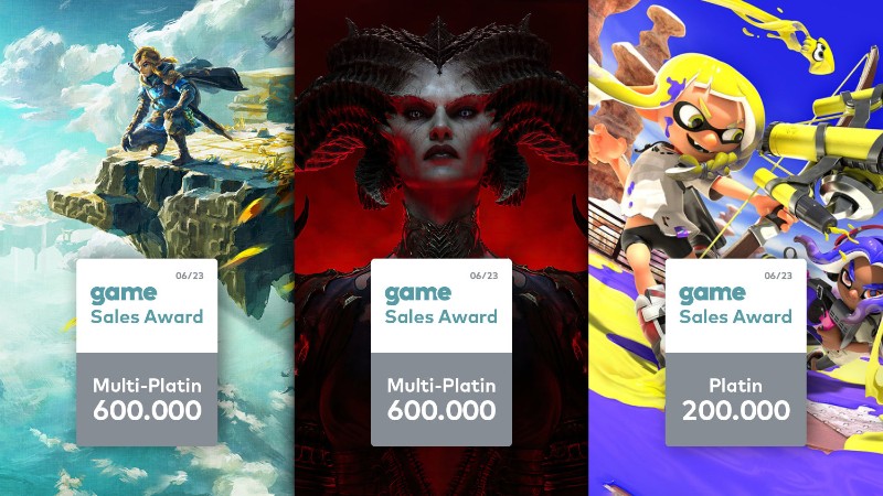 Für ihre besonderen Verkaufserfolge zeichnet der game – Verband der deutschen Games-Branche im Juni drei Spiele mit dem game Sales Award aus: Das Action-Rollenspiel „Diablo IV“ bekommt für über 600.000 verkaufte Titel den Sales Award in der höchsten Kategorie Multi-Platin. In der Fortsetzung der gleichnamigen Games-Reihe begeben die Spielenden sich auf eine abenteuerliche Reise in eine Welt zwischen Himmel und Hölle. Ebenfalls mit einem game Sales Award Multi-Platin wird „The Legend of Zelda: Tears of the Kingdom“ ausgezeichnet. Im Action-Adventure tauchen die Gamerinnen und Gamer in die Rolle des beliebten Spieleprotagonisten Link ein und werden Teil eines epischen Abenteuers auf dem Boden sowie am Himmel von Hyrule. Einen Award in Platin erhält im Juni der bunte Third-Person-Shooter mit Online-Mehrspielerpartien „Splatoon 3“, der sich über 200.000-mal verkauft hat.