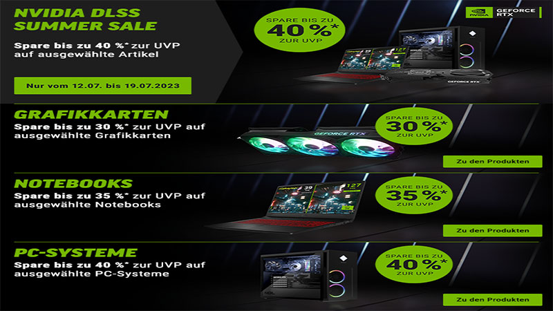 Bei Notebooksbilliger ist gestern der “NVIDIA DLSS Summersale” gestartet. Eine Woche lang gibt es bis zu 40 % auf ausgewählte Artikel. Wer also eine neue Grafikkarte, Notebook oder gleich ein ganzes PC-System zu einem günstigen Preis erwerben möchte, hat noch bis zum 19. Juli die Gelegenheit dazu. Nachfolgend gibt es eine aufgelistete Übersicht der zehn besten GPU- und Laptop-Deals.