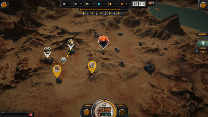 Da die Ressourcen in der Siedlung und Umgebung, die pro Kapitel wechselt, begrenzt sind, sind wir auf Expeditionen in die nähere Umgebung angewiesen. Hierbei senden wir einen Trupp an Bewohnern aus, welche losziehen und verschiedenste Strukturen der alten Welt erkunden. Die riskanten Expeditionen können tödlich enden, aber bieten auch die Gelegenheit auf wertvolle Ressourcen, Informationen oder auch neue Bewohner, wenn man Überlebende findet. Doch damit die Expedition gelingt, müssen auch deren Teilnehmer mit Nahrung und Wasser ausgestattet werden. Ebenso ist ein kleiner Vorrat an Schrott sinnvoll, um z.B. Leitern oder Brücken zu bauen. Doch nicht immer ist eine auf den ersten Blick sinnvolle Lösung die Richtige. Was nach einer gewissen Spielzeit auffällt ist, dass sich die Orte wiederholen. Diese sind offensichtlich bis auf ein paar relevante Orte immer zufällig angeordnet und die Events dort die Gleichen. Hat man also eine gewisse Zeit gespielt, kennt man die Ausgänge und die besten Lösungen – was allerdings nicht bedeutet, das es das Spiel leichter macht. Homeseek verzeiht keinen Fehler.