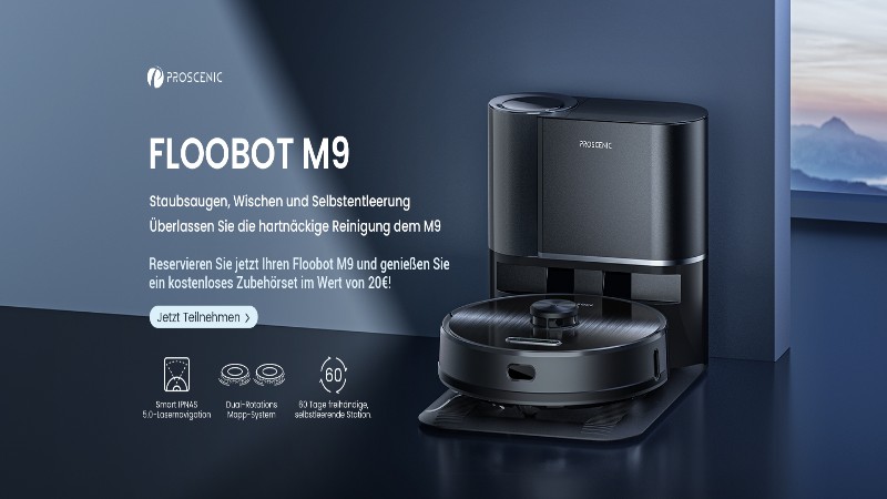 „Der Floobot M9 ist unsere neueste Innovation, die den Komfort eines selbstentleerenden Staubsaugerroboters nahtlos mit außergewöhnlichen Wischfähigkeiten kombiniert“, sagt Miles Jiang, Vice President von Proscenic. „Mit dem Floobot M9 wollen wir das Reinigungserlebnis neu definieren und unseren Kunden eine umfassende und bequeme Lösung an die Hand geben, die ihren wachsenden Bedürfnissen gerecht wird.“