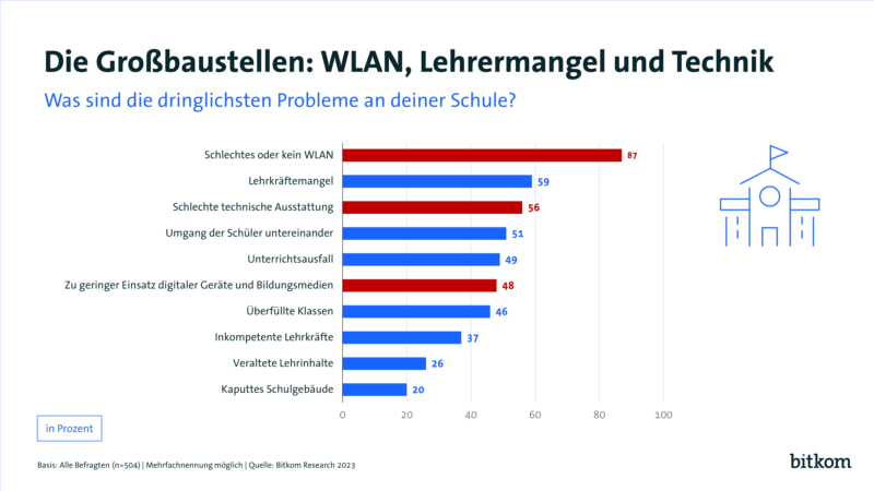 Als weitere drängende Probleme werden in der Studie der Umgang der Schülerinnen und Schüler untereinander (51 Prozent) sowie der Ausfall von Unterricht (49 Prozent) genannt. Für knapp die Hälfte (48 Prozent) gehören auch der zu geringe Einsatz digitaler Geräte und Bildungsmedien sowie überfüllte Klassen (46 Prozent) zu den dringlichsten Problemen an ihrer Schule, gefolgt von aus Sicht der Schülerinnen und Schüler inkompetenten Lehrkräften (37 Prozent), veralteten Lerninhalten (26 Prozent) und kaputten Schulgebäuden (20 Prozent).
